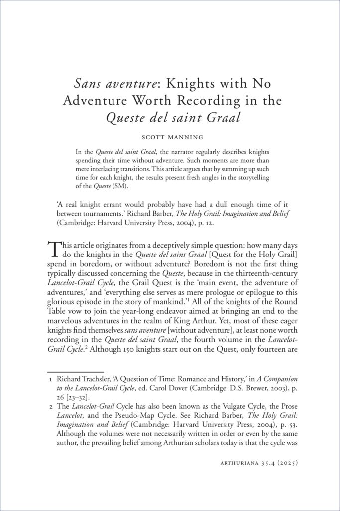 “Sans Aventure: Knights with No Adventure Worth Recording in the Queste del saint Graal,” Arthuriana: The Journal of Arthurian Studies 35.4 (2025): 76-100.