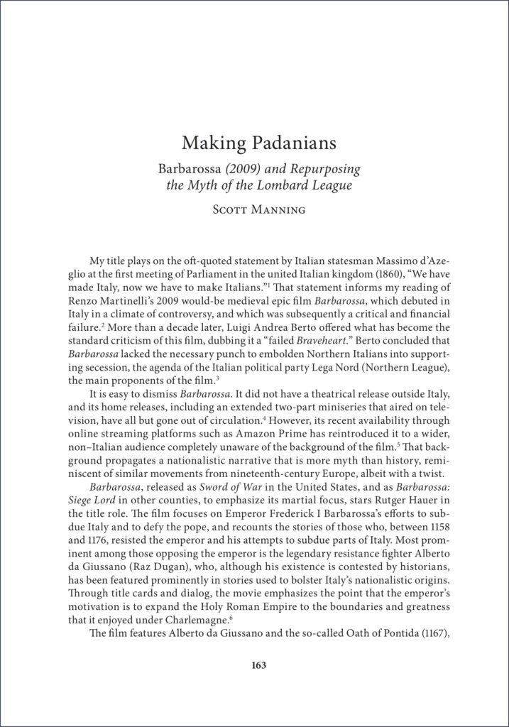 “Making Padanians: Barbarossa (2009) and Repurposing the Myth of the Lombard League,” Cinema Medievalia: New Essays on the Reel Middle Ages, eds. Kevin J. Harty and Scott Manning (Jefferson: McFarland, 2024), 163-180.