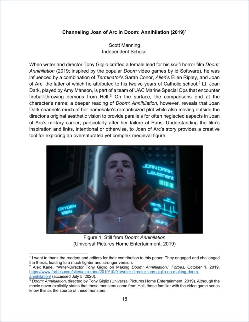 “Channeling Joan of Arc in Doom: Annihilation (2019),” The Year’s Work in Medievalism 34 (2019): 18-31.