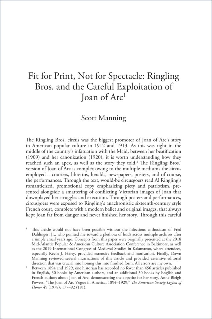 “Fit for Print, Not for Spectacle: Ringling Bros. and the Careful Exploitation of Joan of Arc,” Studies in Medievalism XXX (2021): 229-252.