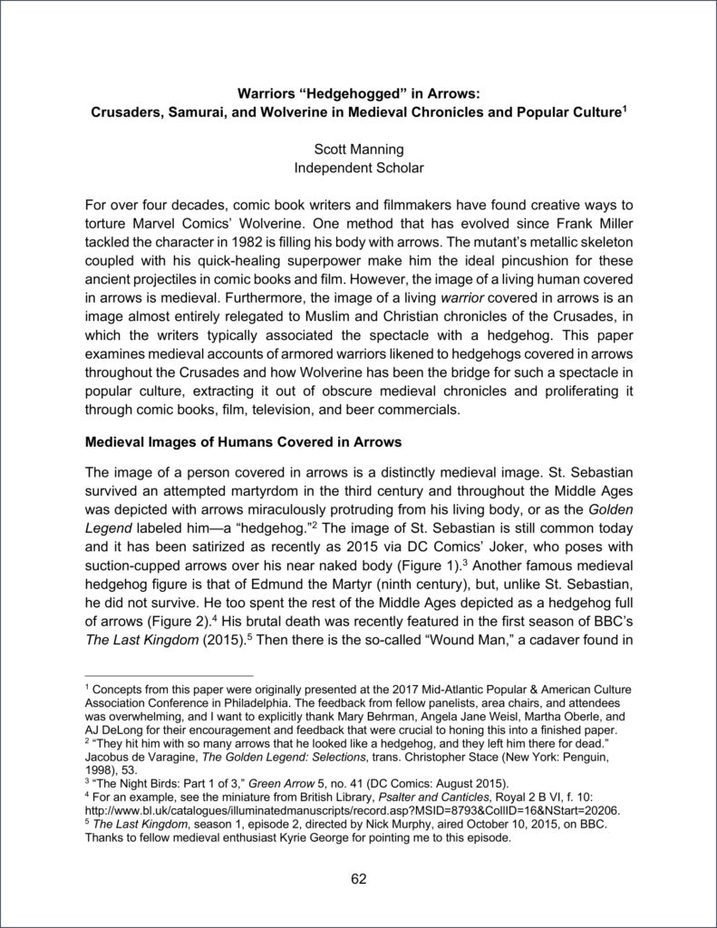 “Warriors ‘Hedgehogged’ in Arrows: Crusaders, Samurai, and Wolverine in Medieval Chronicles and Popular Culture,” The Year’s Work in Medievalism 33 (2018): 62-77.