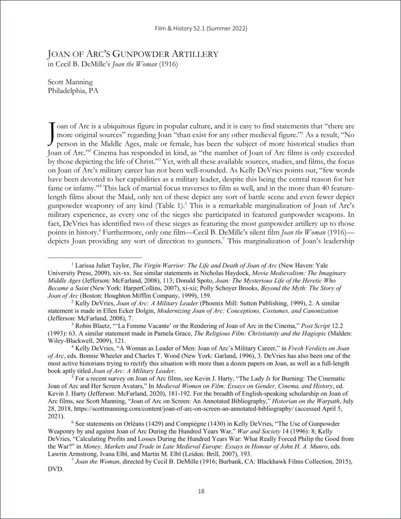 “Joan of Arc’s Gunpowder Artillery in Cecil B. DeMille’s Joan the Woman (1916),” Film & History: An Interdisciplinary Journal 51.1 (2022): 18-31.