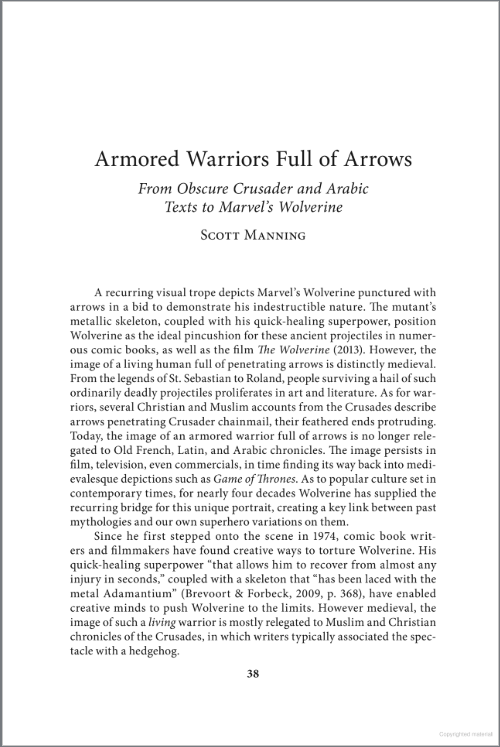 “Armored Warriors Full of Arrows: From Obscure Crusader and Arabic Texts to Marvel’s Wolverine,” Analyzing the Marvel Universe: Critical Essays on the Comics and Film Adaptations, ed. Douglas Brode (Jefferson: McFarland, 2024), 38-49.