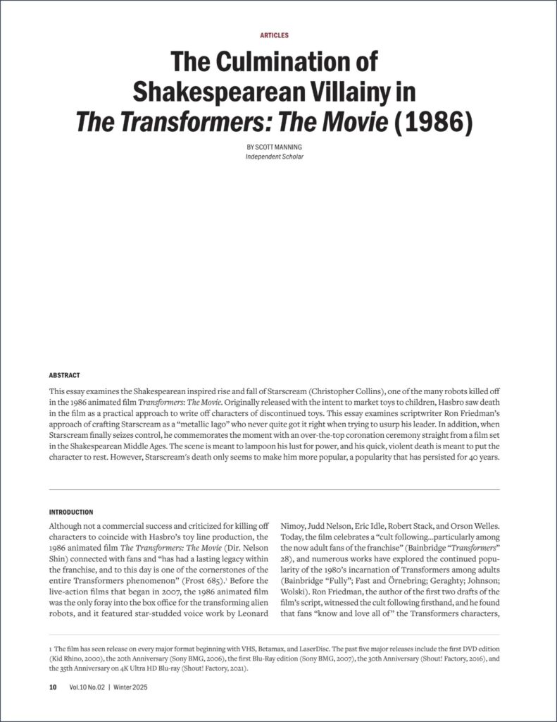 “The Culmination of Shakespearean Villainy in The Transformers: The Movie (1986),” Mise-en-scène: The Journal of Film & Visual Narration 10.2 (Winter 2025): 10-18.